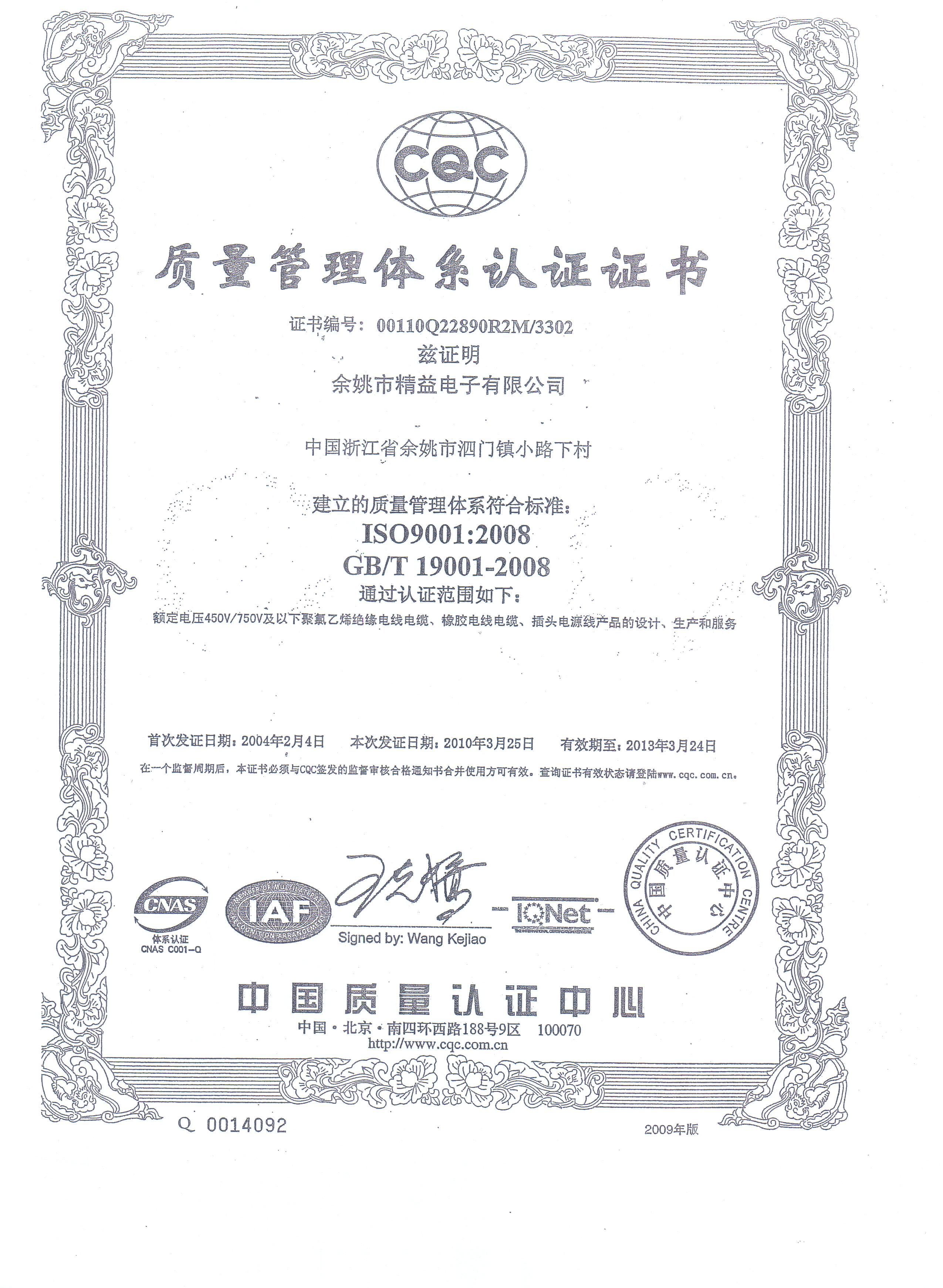 余姚市精益电子有限公司--通过ISO9001:2008体系认证
